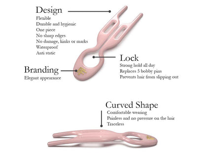 La forma curva, el cierre confiable, la flexibilidad y el material higiénico hacen que el Nº1 HAIRPIN sea una herramienta única para el cabello. Su agarre es al menos 5 veces más fuerte que un pasador promedio. Debido a la forma curva, el pasador se adapta cómodamente a tu cabello y permanece allí todo el día sin que lo sientas. El pasador es fácil de usar, no daña tu cabello y no deja marcas. ¡Y lo mejor es que mantendrá el volumen vivo todo el día!