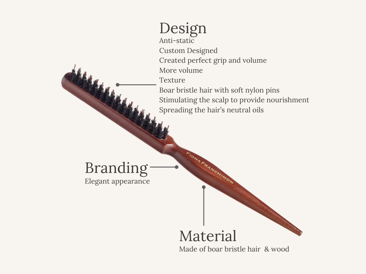 The Fiona Franchimon Backcomb Brush with boar hair is perfect for backcombing and teasing. Create more volume and texture. You will have amazing grip and extra hold for placing the Nº1 HAIRPINs. Besides the volume, the boar hair bristles provide nourishment by stimulating and massaging the scalp and gently spreading the hair’s natural oils. It's also perfect to brush your hair out easily.