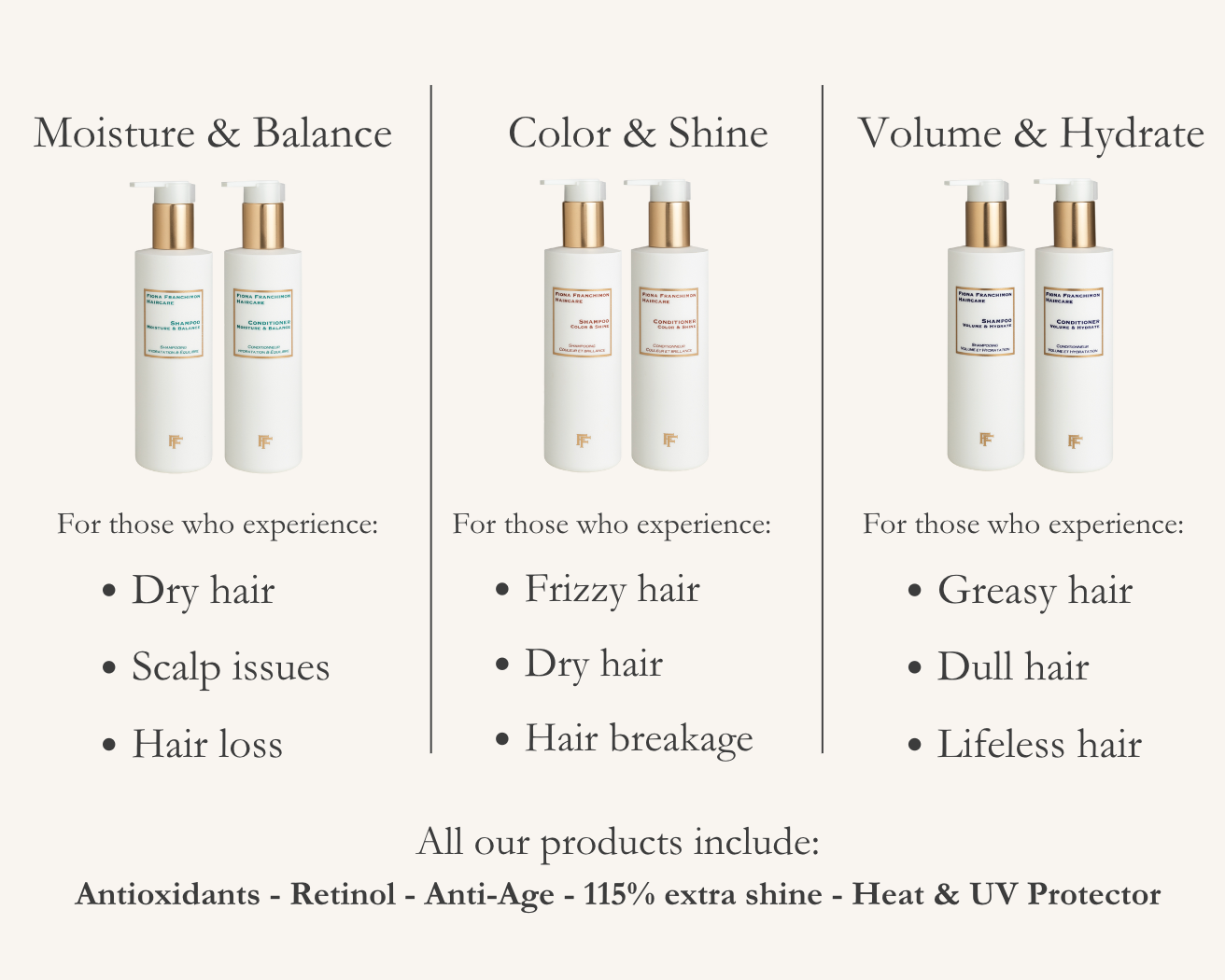 With 25 years of knowledge Fiona Franchimon created her own innovative haircare line with new formulations, honest ingredients and high-end performance for both hair and skin. High-quality haircare with natural ingredients that give shine and a bouncy volume. Feel elegant and confident.