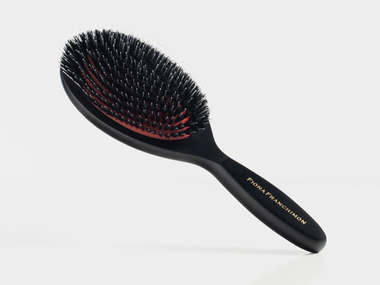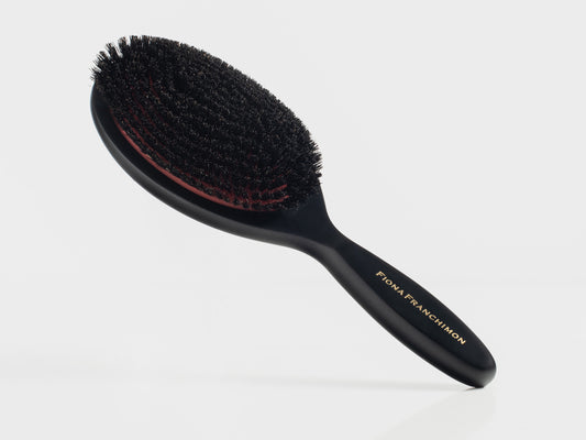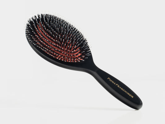 The Fiona Franchimon Brush for Polish is designed to smooth frizz and flyaways while maintaining your hair’s natural volume. Crafted with premium boar bristles, it enhances shine and delivers a sleek, polished finish with every stroke. The variation in bristle height ensures the brush grips the hair perfectly, making it ideal for creating refined styles without flattening your look. Handcrafted and anti-static, it leaves your hair radiant, controlled, and effortlessly elegant.
