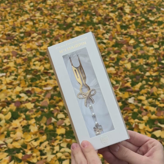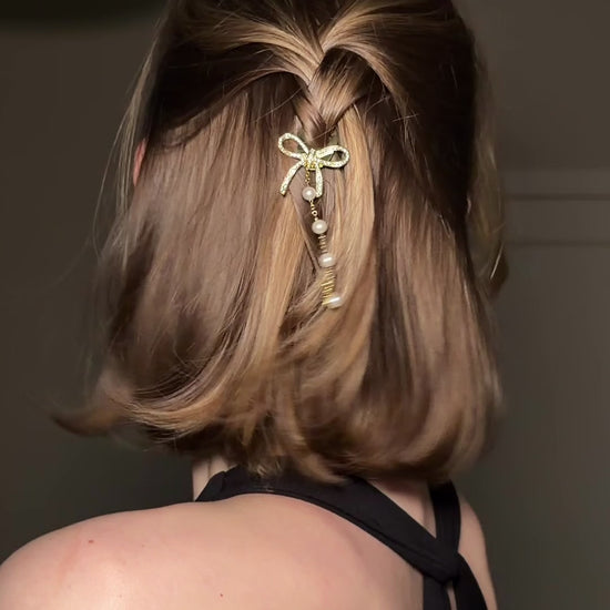 The Nº1 Hairpin Pendant features a sculpted ribbon shape, detailed with Swarovski® crystals that catch the light beautifully. A delicate pearl strand adds a touch of classic charm, giving the piece a refined, exclusive feel.