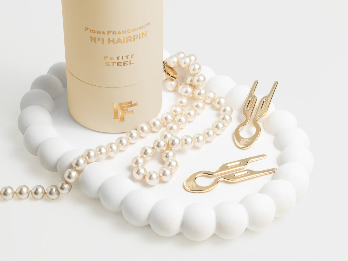 Two Nº1 HAIRPINS Petite Steel, presented in a signature white with gold tube with a soft satin travel bag – ideal for storage and light polishing.